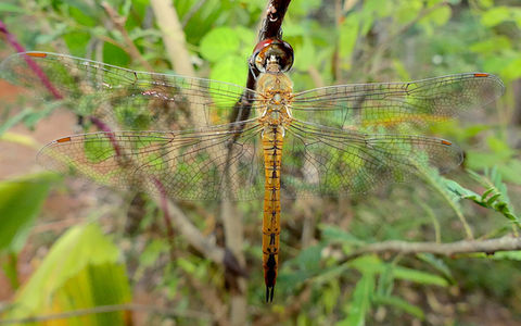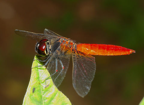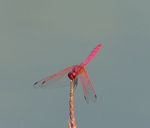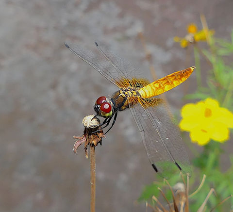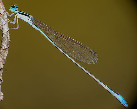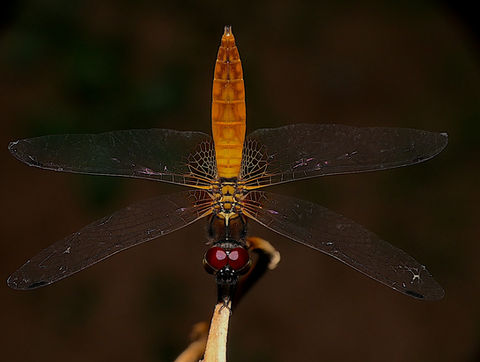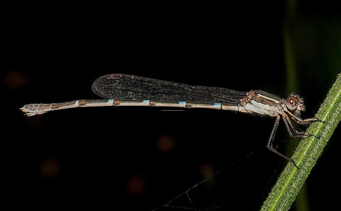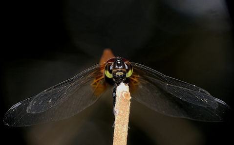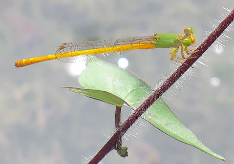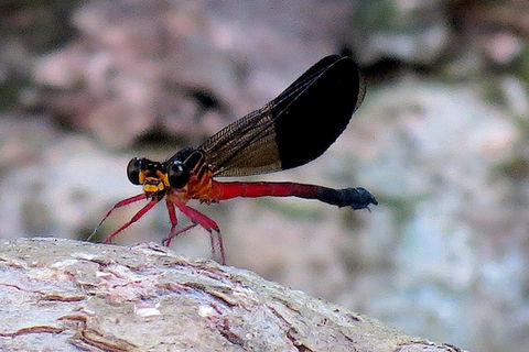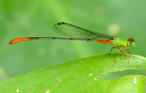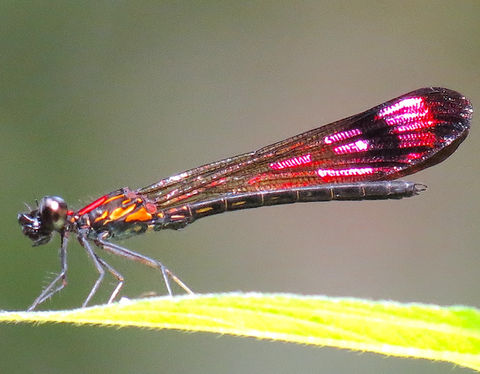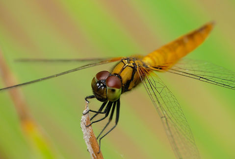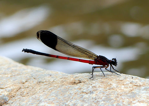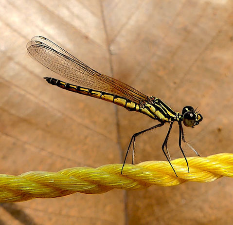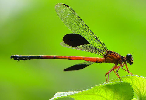 Odonata is an order of predatory flying insects that includes the dragonflies and damselflies. The two groups are distinguished with dragonflies (suborder Anisoptera) usually being bulkier with large compound eyes together and wings spread up or out at rest, while damselflies (suborder Zygoptera) are usually more slender with eyes placed apart and wings folded together along body at rest. Adult odonates can land, but rarely walk.